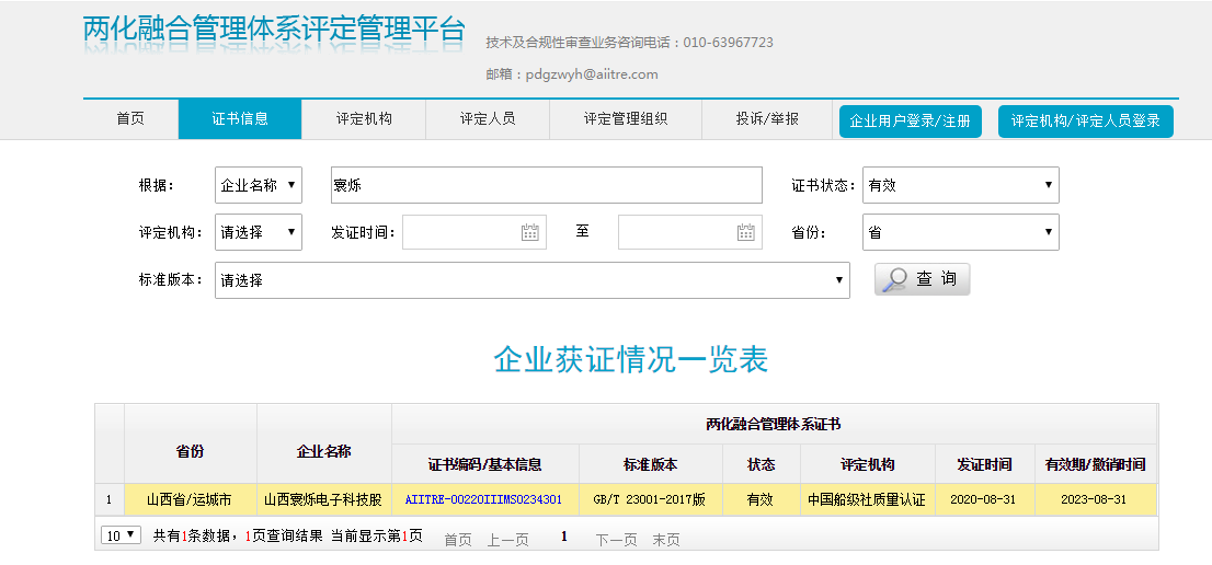2020年8月31日,山西寰爍電子科技股份有限公司順利通過國家工業(yè)和信息化部《信息化和工業(yè)化融合管理體系要求》(GB/T 23001-2017)體系認(rèn)證,獲得由工信部審核、中國船級社質(zhì)量認(rèn)證公司簽發(fā)的兩化融合管理體系評定證書。
