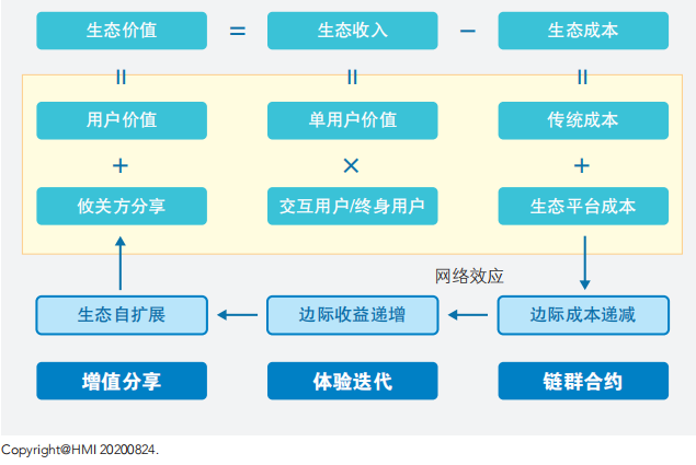 1993年,美國(guó)經(jīng)濟(jì)學(xué)家詹姆斯·穆?tīng)柼岢隽松虡I(yè)生態(tài)系統(tǒng)概念,認(rèn)為生態(tài)有三個(gè)特征:輕;不可模仿;放大性。所謂“輕”,就像亞馬孫熱帶雨林,不需要種樹(shù),植物自會(huì)生長(zhǎng)。所謂“不可模仿”,可以模仿創(chuàng)建一個(gè)花園,但不可能模仿創(chuàng)建一個(gè)生態(tài)。所謂“放大性”,生態(tài)生生不息,可以產(chǎn)生新物種,而花園不可能產(chǎn)生新物種。