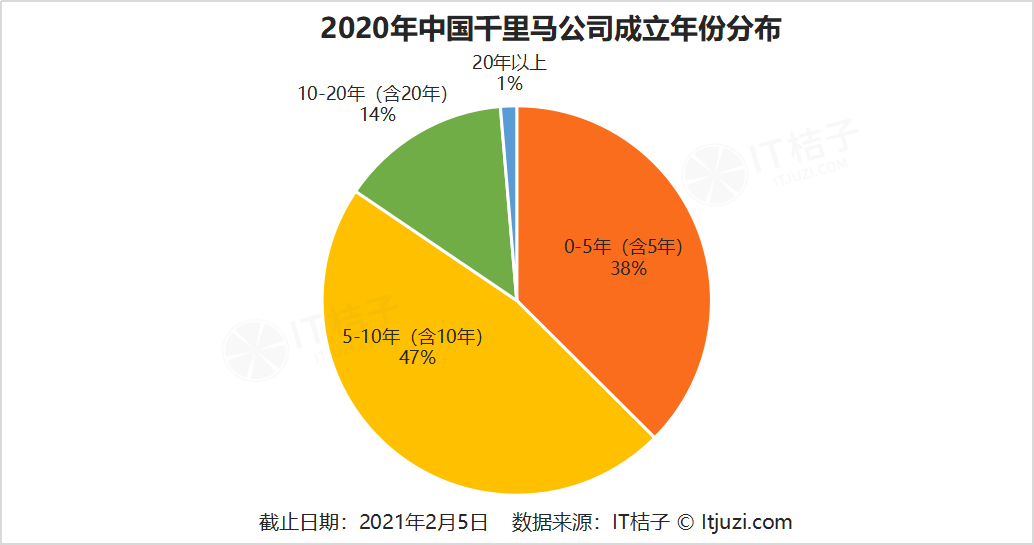 IT 桔子數(shù)據(jù)顯示,當前千里馬企業(yè)名單中,37% 的企業(yè)在 2015 年及以后成立,成立 5 以內(nèi),47% 的企業(yè)成立時間在 5-10 年,此外有 104 家(14%)企業(yè)歷史超過了 10 年,甚至還有 10 家企業(yè)有超過 20 年的歷史。