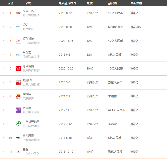排名第三的是無人機解決方案服務商極飛科技。2020 年 11 月在完成最新一輪融資后,極飛科技估值達到 60 億元。同樣,股指在 60 億元并在 2020 年完成新一輪融資的還有藥物上門配送平臺叮當快藥與網(wǎng)絡音頻應用蜻蜓 FM,兩者都是其所在賽道中頭部品牌之一。資料顯示,叮當快藥在 2020 年 10 月 20 日完成最新一輪融資,蜻蜓 FM 在在 2020 年 3 月完成最新一輪融資,投后估值 60 億元。