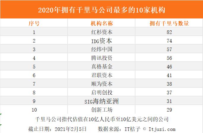 IT 桔子數(shù)據(jù)顯示,當前擁有千里馬公司最多的機構是紅杉資本中國。它手中的 82 只千里馬公司包括達令家、德昇濟醫(yī)藥 D3 Bio、唱吧、雪球等各個賽道中的優(yōu)秀項目。