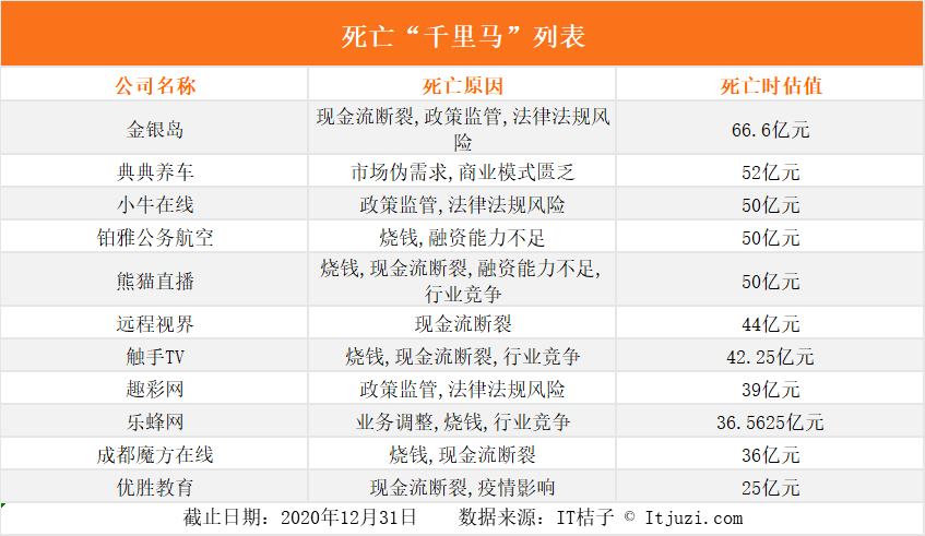 縱觀上表,資金鏈斷裂是千里馬消亡的核心原因之一,包括鉑雅公務航空、遠程視界、樂蜂網(wǎng)、成都魔方在線、優(yōu)勝教育均死于「沒錢了」。此外法律風險也是創(chuàng)業(yè)的紅線,小牛在線、趣彩網(wǎng)也因為踩在了紅線上,最終關停。