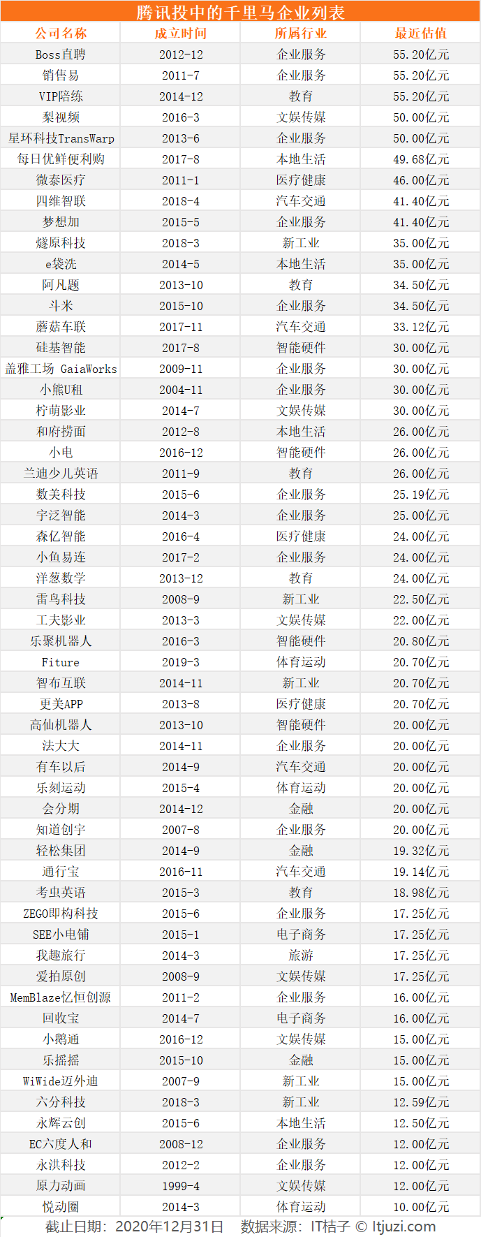 騰訊作為 CVC 一直熱衷于參與投資創(chuàng)業(yè)公司,因近年來騰訊在投資方面的動作相對突出,我們也將其視為投資機構看待。2020 年千里馬名單中,騰訊擁有 56 只,包括禾賽科技、銷售易、凹凸租車等企業(yè)。