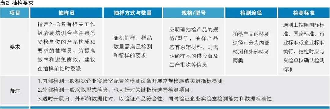 監(jiān)督抽檢的重點(diǎn)是理化性能,特別是安全性能指標(biāo)。監(jiān)督部門應(yīng)提前制定樣品抽檢計(jì)劃,明確抽樣員、抽樣方式與數(shù)量、規(guī)格/型號(hào)、檢測(cè)途徑及檢測(cè)標(biāo)準(zhǔn)等信息,參見表2。