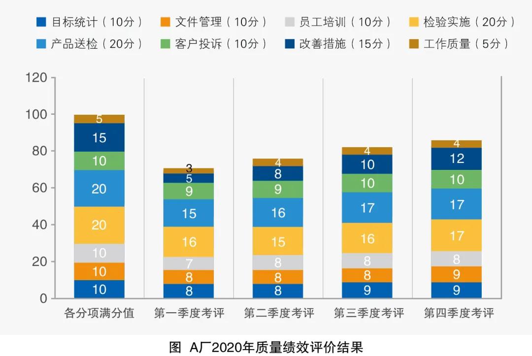 監(jiān)督部門定期制作質(zhì)量數(shù)據(jù)分析圖表(以A工廠2020年的質(zhì)量績(jī)效評(píng)價(jià)結(jié)果為案例,詳見下圖),公布存在的問題及改進(jìn)建議,促使相關(guān)部門更好地實(shí)施質(zhì)量改進(jìn)。監(jiān)督部門應(yīng)根據(jù)活動(dòng)過程與結(jié)果適時(shí)組織相關(guān)部門和人員進(jìn)行檢討論證,出臺(tái)措施,并開展“回頭看”,驗(yàn)證其有效性,對(duì)科學(xué)合理有效的方法進(jìn)行標(biāo)準(zhǔn)化。