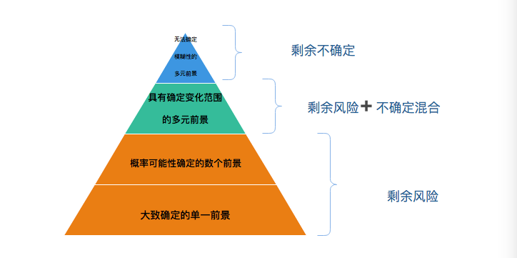 我們認(rèn)為,以上四個(gè)層次中只有第四層才是真正意義上的不確定性或剩余不確定性,而前三層均屬于不同風(fēng)險(xiǎn)性類別,并不屬于不確定性。換言之,風(fēng)險(xiǎn)性是指,雖然無法完全確定未來情境,但可以大體預(yù)測(cè)前景的可能性范圍,即未來為部分可知,至少從統(tǒng)計(jì)學(xué)概率角度而言。不確定性則是指無法預(yù)見哪些前景可能發(fā)生,以及它們發(fā)生的可能性范圍,也就是說無法確認(rèn)統(tǒng)計(jì)學(xué)概率,即未來為完全不可知。