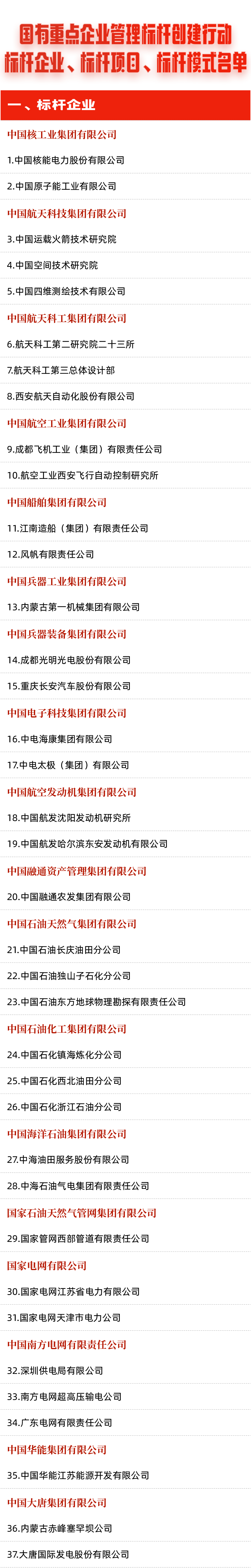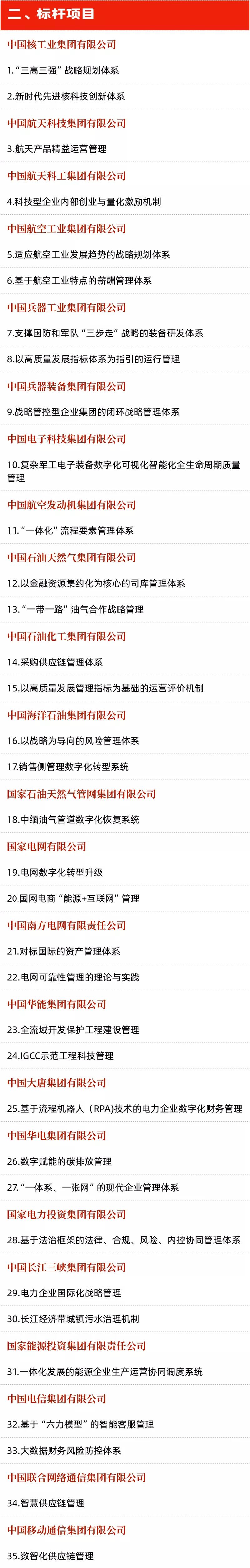 日前,國務(wù)院國資委組織開展國有重點(diǎn)企業(yè)管理標(biāo)桿創(chuàng)建行動(dòng),公布了管理標(biāo)桿企業(yè)、標(biāo)桿項(xiàng)目和標(biāo)桿模式(以下簡稱“三個(gè)標(biāo)桿”)名單,促進(jìn)國有企業(yè)不斷強(qiáng)化管理體系和管理能力建設(shè), 推動(dòng)與世界一流對標(biāo)、加快向世界一流邁進(jìn)。