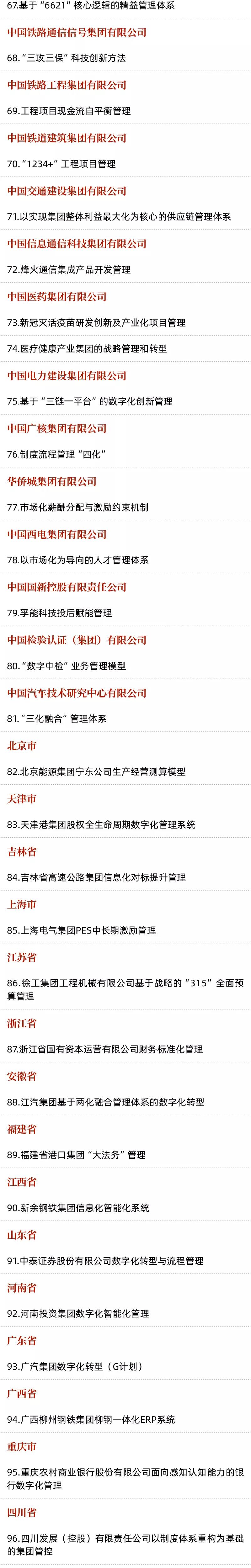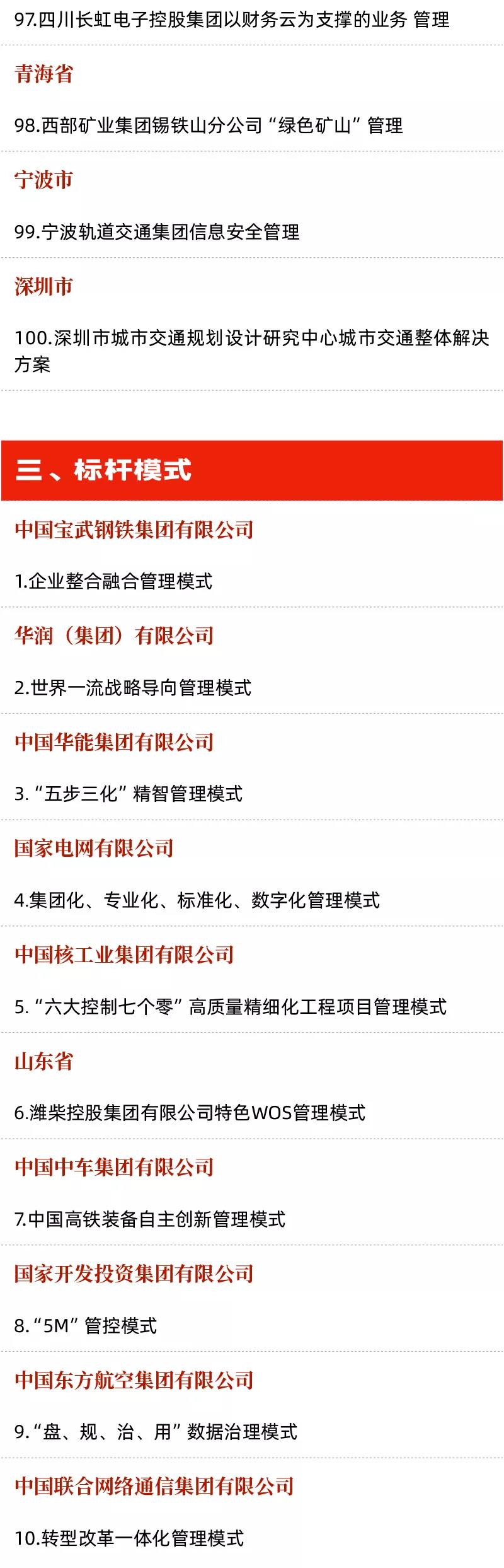 管理標(biāo)桿創(chuàng)建行動(dòng)歷經(jīng)企業(yè)申報(bào)、專家評審、征求意見等環(huán)節(jié),最終確定的“三個(gè)標(biāo)桿”包含200家標(biāo)桿企業(yè)、100個(gè)標(biāo)桿項(xiàng)目和10個(gè)標(biāo)桿模式。文末附具體名單。