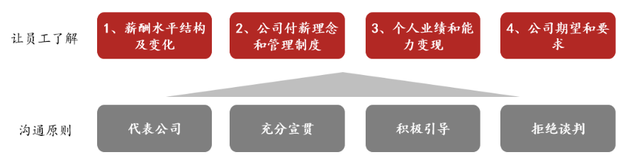 一般而言,當(dāng)員工薪酬有所變化時(shí),便可以開展薪酬溝通,一方面是將企業(yè) 的薪酬制度,以及員工個(gè)人的定薪信息和調(diào)整規(guī)則準(zhǔn)確無(wú)誤地傳達(dá)給員工,并與員工交流、交換意見;另一方面是與員工進(jìn)行反饋面談,提升員工自我認(rèn)知,并提出未來(lái)發(fā)展目標(biāo)和期許。