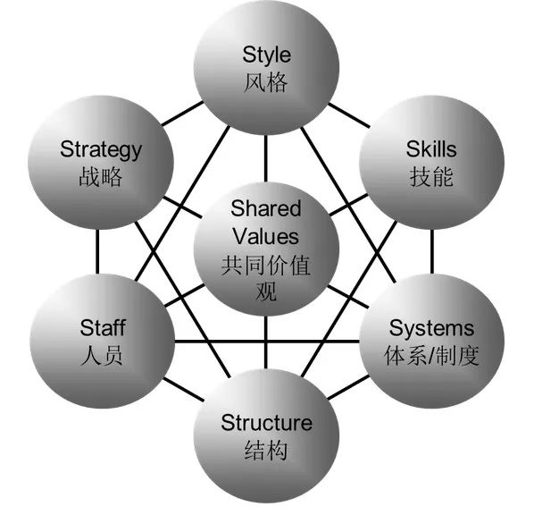 麥肯錫提出的企業(yè)組織七要素,指出了企業(yè)在發(fā)展過程中必須全面地考慮各方面的情況,包括結構(structure)、制度(system)、風格(style)、員工(staff)、技能(skill)、戰(zhàn)略(strategy)、共同的價值觀(shared values)。