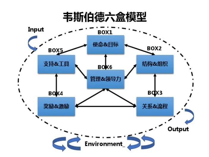 六個盒子,也叫韋斯伯德六盒模型,是由美國組織動力學教授韋斯伯德提出,包括組織的六個維度,分別是:使命/目標、結構/組織、關系/流程、回報/激勵、支持/幫助、領導/管理。