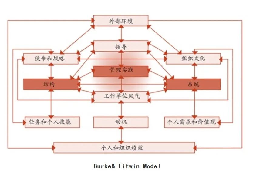 這個模型上半部分,強調的是外部環(huán)境的變化促發(fā)的愿景、使命、文化、戰(zhàn)略調整,以及為應對外部環(huán)境變化需要的領導力變革。而下半部分,強調的是內部組織結構、制度流程、團隊協(xié)作風格、崗位能力要求、個人及組織績效等方面的轉型。