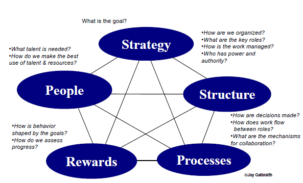 以前我在一家跨國公司工作時,公司培訓HR們使用過一個相對簡單的模型,同樣可以很方便地起到診斷和評估組織能力的作用。該模型包括5個方面,和麥肯錫的7S模型比較接近。