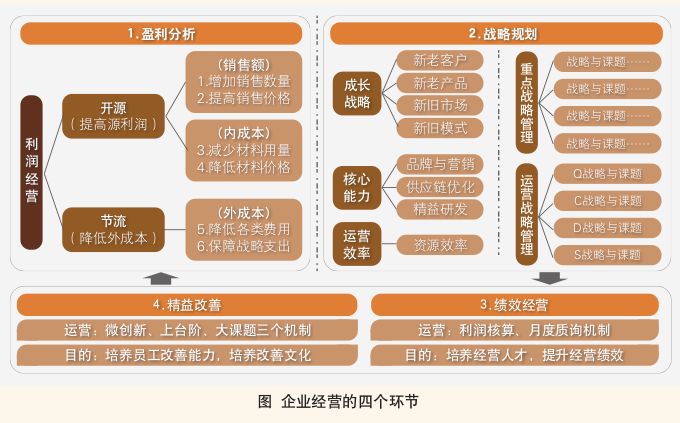 從邏輯思考和實現方式的角度,企業(yè)獲取利潤的流程都是一個閉環(huán),具體包括盈利分析、戰(zhàn)略規(guī)劃、績效經營和精益改善等四個關鍵環(huán)節(jié)。