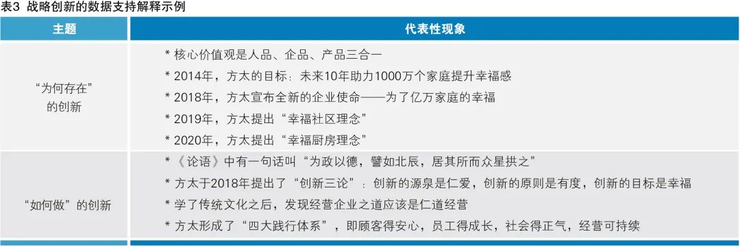 自創(chuàng)立以來,方太始終專注于高端廚房電器,戰(zhàn)略創(chuàng)新主要圍繞企業(yè)“為何存在”和“如何做”展開。其中“為何存在”主要涉及使命、目標的創(chuàng)新,“如何做”主要涉及內(nèi)部機制、盈利模式創(chuàng)新,如表3所示。