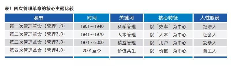 從“效率第一”到“價(jià)值第一”,管理學(xué)走過了一百多年的歷史,不斷推動從“經(jīng)濟(jì)人”到“自主人”的跨越。見表1。