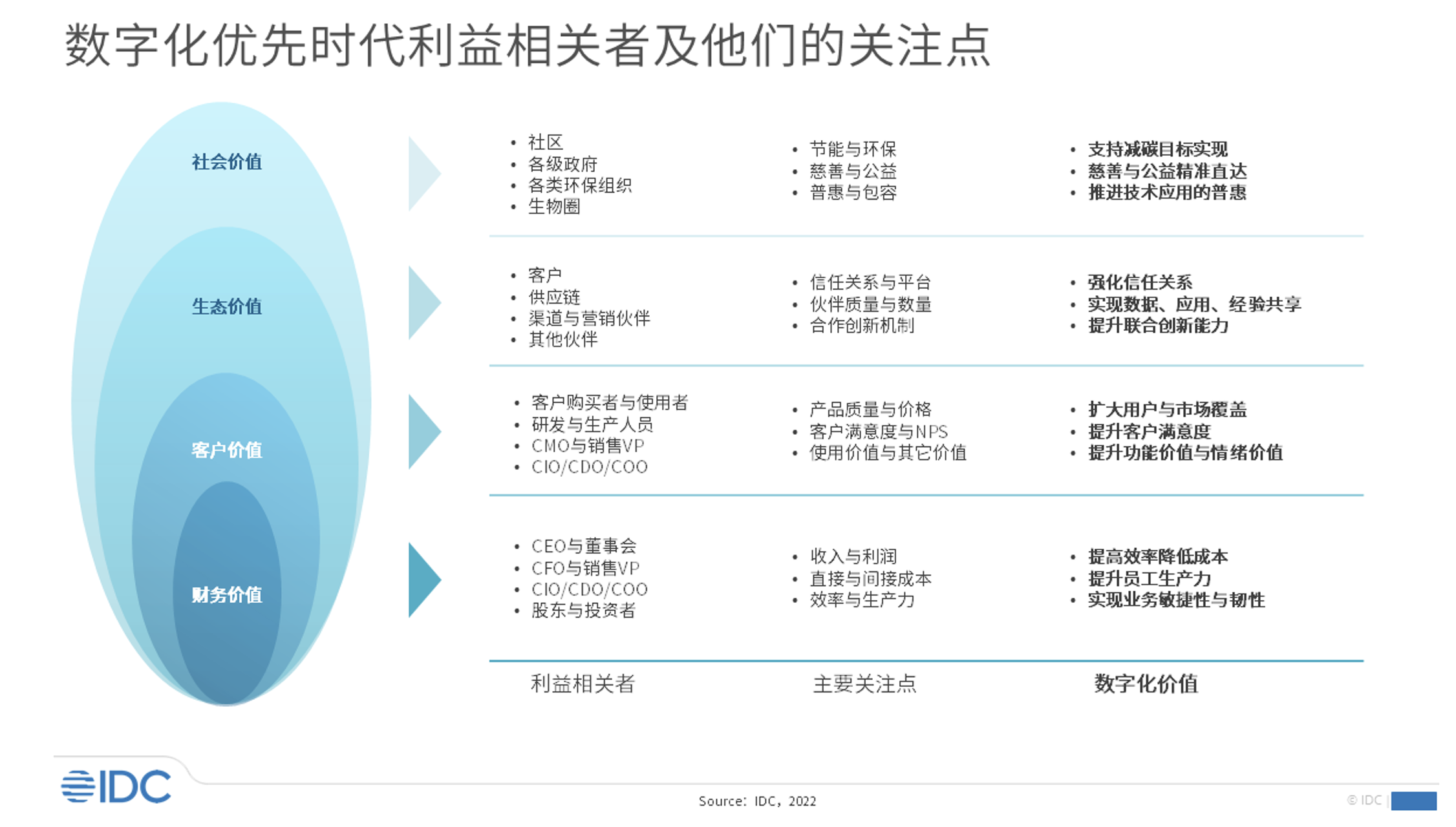 數(shù)字化優(yōu)先不是單純的技術(shù)或商業(yè)模式,而是企業(yè)的一種遠(yuǎn)景,一種對(duì)數(shù)字技術(shù)價(jià)值的認(rèn)可、期待和行動(dòng)。數(shù)字化優(yōu)先時(shí)代要求規(guī)?;瘎?chuàng)新可持續(xù)化、情景化、實(shí)時(shí)化。數(shù)字化優(yōu)先也在重新定義數(shù)字化的價(jià)值:財(cái)務(wù)價(jià)值、客戶價(jià)值、生態(tài)價(jià)值、社會(huì)價(jià)值。