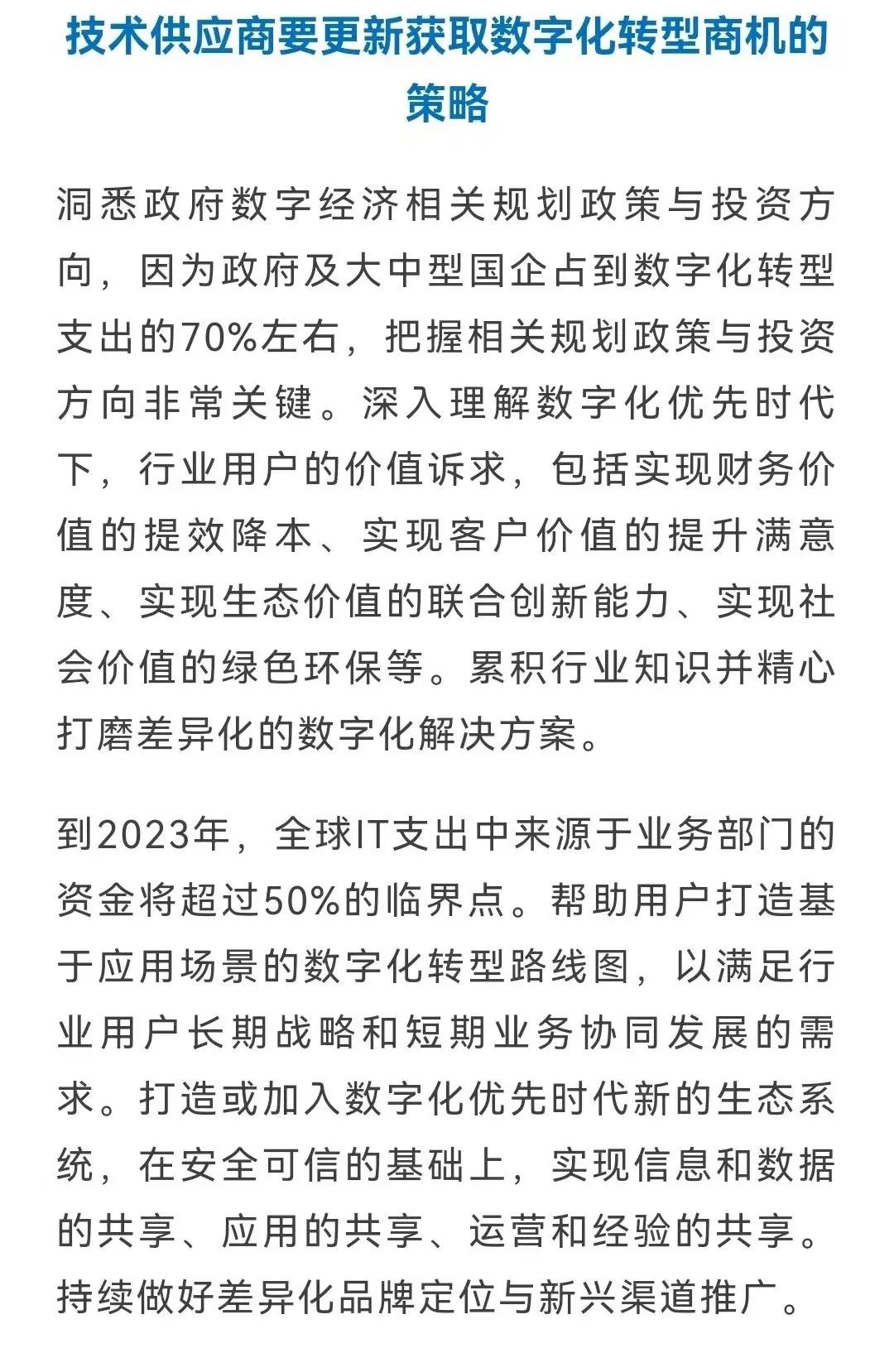 報(bào)告也分析了中國(guó)數(shù)字化轉(zhuǎn)型獨(dú)特的市場(chǎng)環(huán)境,包括數(shù)字化轉(zhuǎn)型特征、市場(chǎng)驅(qū)動(dòng)因素、市場(chǎng)阻礙因素,并簡(jiǎn)要分析了可能影響企業(yè)數(shù)字化轉(zhuǎn)型的三個(gè)重大市場(chǎng)變化。并為數(shù)字化轉(zhuǎn)型技術(shù)提供商更好地獲取商機(jī)給出了六大策略建議。