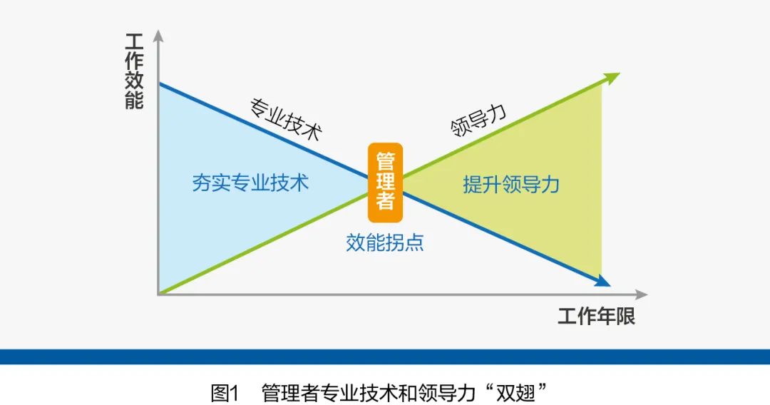 隨著工作年限增長和職位提升,員工的專業(yè)技術(shù)對工作效能的貢獻(xiàn)率逐漸降低,其領(lǐng)導(dǎo)力對工作效能的貢獻(xiàn)率則不斷提升,兩條效能線的交匯點是員工可能成為管理者的重要節(jié)點,如圖1所示。