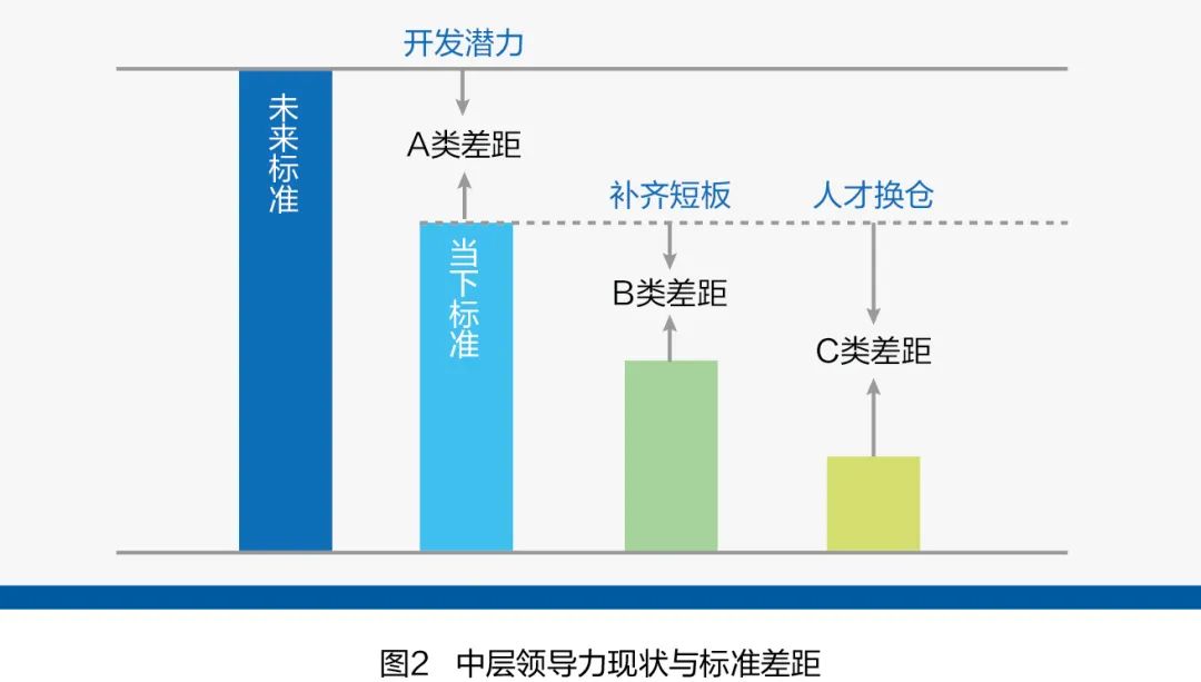 如圖2所示,根據(jù)“二八原則”,選擇20%左右績效好、潛力高的A類中層管理者納入關(guān)鍵人才后備梯隊,作為當(dāng)下標(biāo)準(zhǔn)對標(biāo)未來領(lǐng)導(dǎo)力標(biāo)準(zhǔn)(領(lǐng)導(dǎo)力模型),系統(tǒng)化提升領(lǐng)導(dǎo)力;對于70%績效良好但潛力一般的B類中層管理者,對標(biāo)當(dāng)下領(lǐng)導(dǎo)力標(biāo)準(zhǔn),補(bǔ)齊短板即可;對于剩余10%績效差、潛力低的C類中層管理者,通過員工晉升或外部招聘,進(jìn)行人才換倉。