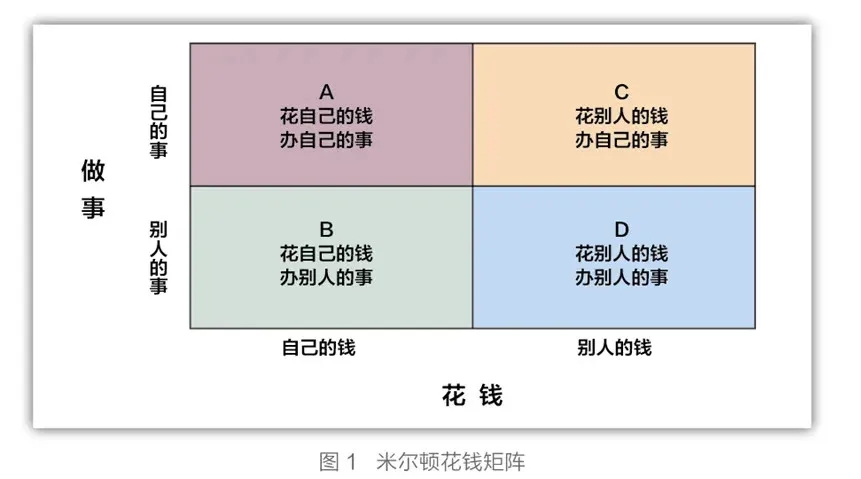 米爾頓教授認(rèn)為,如果以“花錢(qián)”和“做事”作為兩個(gè)維度去分析人們的行為,會(huì)出現(xiàn)以下四種情況(見(jiàn)圖1)。